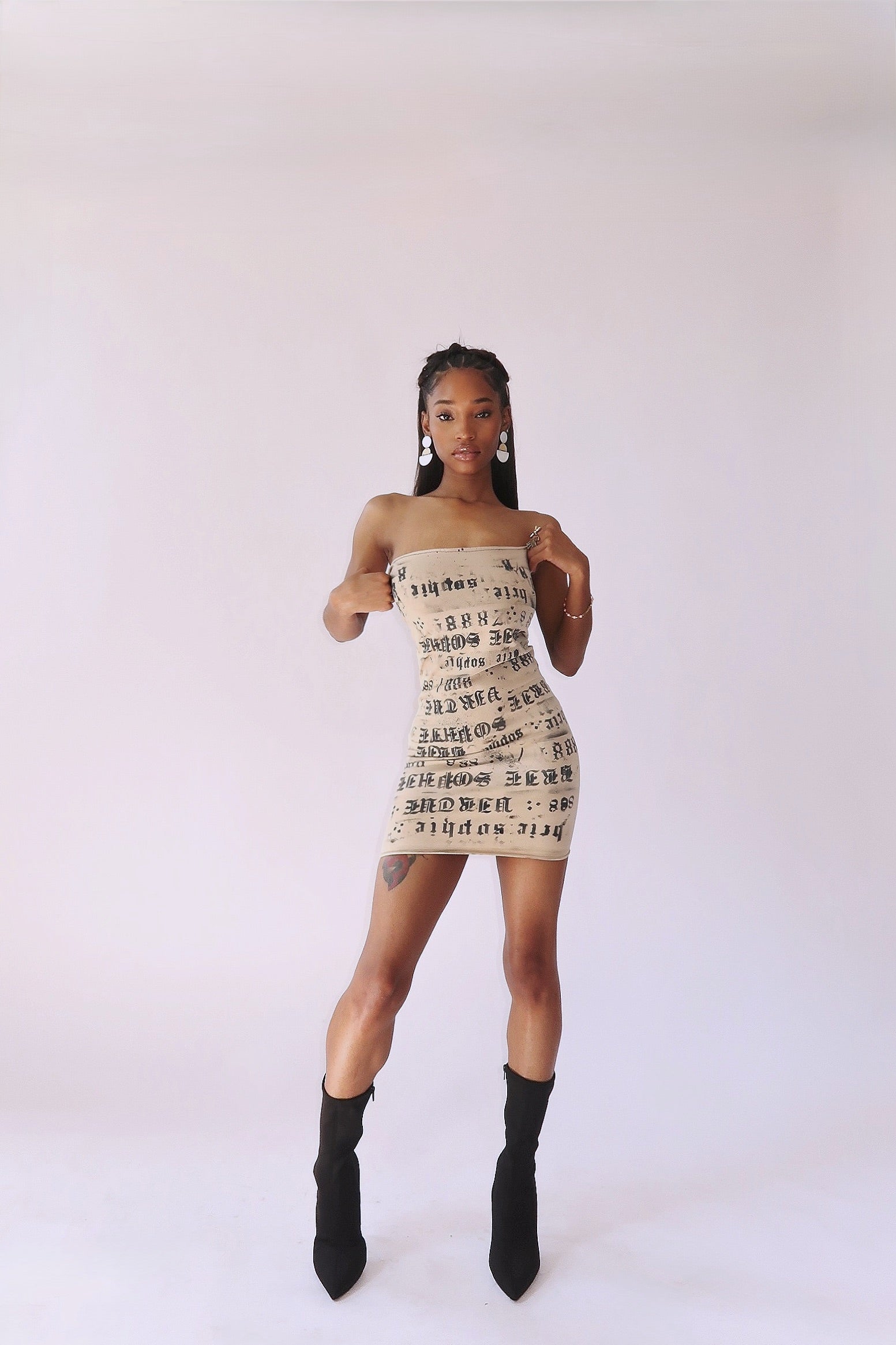 Beige tube dress with BlackΒ 'Brie Sophie' and 888 lettering.Β